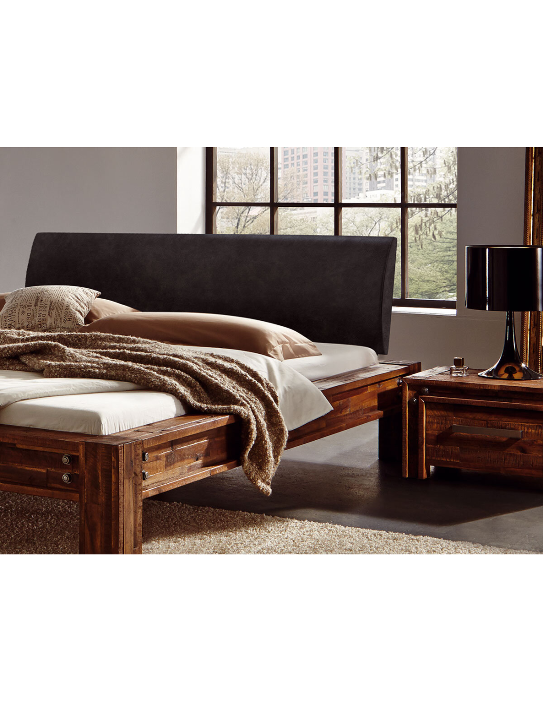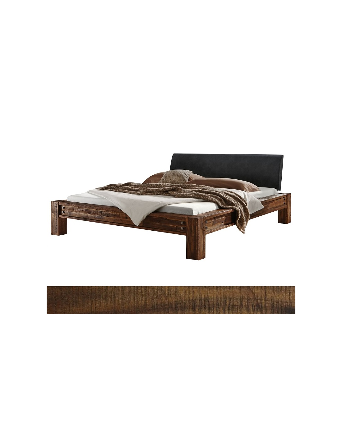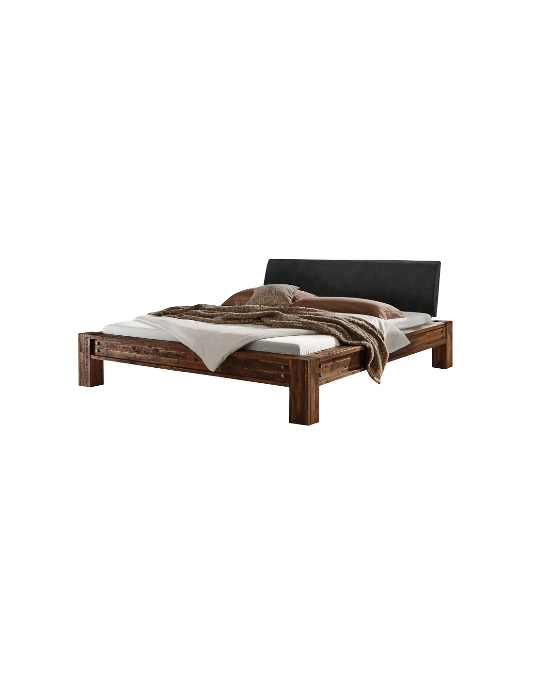 Das Bett San Felipe aus Akazienholz in der Farbe Vintage brown gibt es in den Breiten 140/160 und 180 cm sowie in der Länge 200 cm. Das Kopfteil ist mit einem Bezug aus schwarzem Kunstleder überzogen.